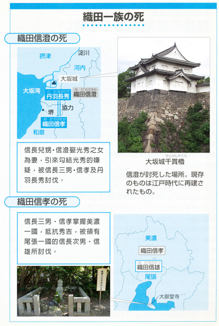 6月27日清須會議,決定由信忠・嫡男三法師繼承織田 家,信孝對此不滿回岐阜城籠城固守,在翌年5月2日被兄 長信雄攻陷岐阜城,信孝被捕,在大御堂寺自害身亡。隨著 織田一族的相繼敗亡,織田大權漸漸落到部將手上。