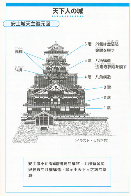 天正4年(1576)正月開始築建的安土城,經過3年 4個月的工程後依然未完工,但城池大体已建成,信長就在 天正7年5月搬進安土城。天主是城主領國與威武的象徵, 安土的天主從外部看有5層,內部實質上有7層構造(6層 在地面,1層在地牢)。最為矚目的是上層4至6樓,5, 6樓有高欄包圍著,6樓外側嵌上金箔,仿傚足利義滿的金 閣的造型,高欄上有仿造寶珠,黑漆的窗格子,內部天井的 天花及牆壁繪上三皇、五帝、孔門十哲等繪畫。5樓是八角 型構造,內部有釋迦與十大弟子的繪畫,內嵌金箔,外側柱 上塗上朱漆,支撐著5樓外側八角型構造的斗拱上有龍及鯱 的雕刻,5樓的外形相信是參考祭祀堅德太子的法隆寺夢殿 。