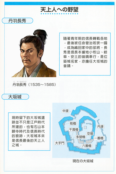 火燒怠盡的石山本願寺遺址,信長計劃建築新城,任命信 長兒甥・織田信澄,及擔任過小牧山、岐阜、安土各城總普 請奉行的築城名家・丹羽長秀負責。翌年2月因為要進攻武 田,令築城工程進度被拖慢。根據『耶穌會日本年報』,信 澄是筆頭城代,次席城代為長秀,二人在築城期間成為大坂 的城代。天正10年6月5日,因為本能寺之變,信澄被懷 疑私通明智光秀,被織田信孝及長秀圍攻,當時大坂城的城 堀、城門、箭櫓都已建好,信澄就是在箭櫓上被圍攻而亡。 來訪安土城及遊覽堺港的徳川家康,本來預定會到大坂城參 觀及與信澄見面,可惜緣慳一面。最終信長都未能目睹大坂 城的落成,本打算在約定將天下讓予信忠後,連同天下之府 ・安土城都送給信忠,讓他管治日本這個天下,自比天上人 的信長則會進入大坂城,大坂城是天上人的居城,脫離狹小 的日本,面向全世界。