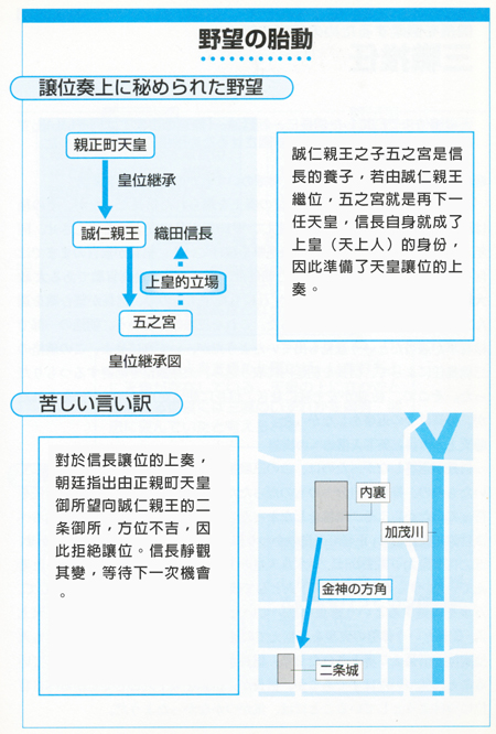 朝廷對於如何回覆信長要天皇讓位的上奏感到苦惱,朝廷 認為若讓皇太子誠仁親王登上皇位,就難以阻止與親王關係 密切的信長控制朝廷,於是朝廷提出陰陽道方位的理由推卻 :「正親町天皇讓位,誠仁親王就任皇位的話,從皇宮禁裏 所望見二条御所的金神之方角並不吉利,因此不能讓位」在 信長壓力下,朝廷要用上陰陽道的理由才能苦苦推卻。「金 神之方角」在陰陽道之中是禁忌的方位,可能會引發災害的 嚴重後果,在今天會被認為是迷信的說法,但在當時卻是人 民生活上的指引。