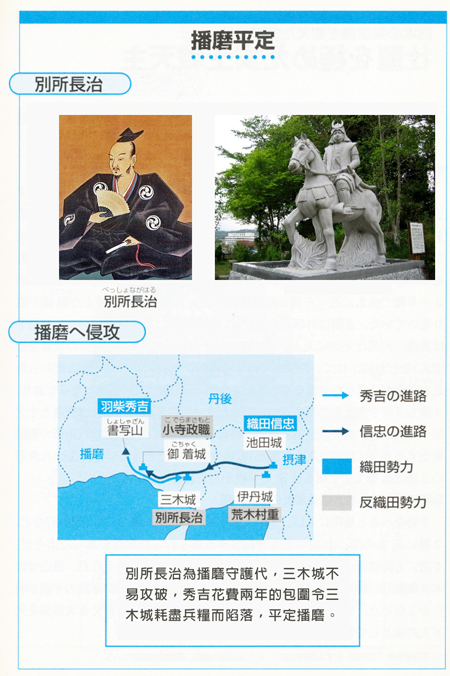 信長委任信忠為播磨攻略的總大將,羽柴秀吉為先鋒,就在 播磨快將統一之際,赤松氏守護代・別所氏、宿老・小寺氏 起兵叛亂。