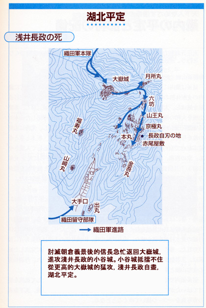 滅掉朝倉氏的信長,從大嶽城發兵進攻小谷城,長政自盡,親妹於巿及3位女兒、嫡男被補。