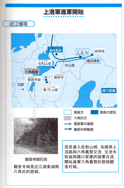 將稻葉山城改築成岐阜城、掌握尾張、美濃兩國、與近江淺井長政同盟後,信長以破竹之勢立於戰國間。永祿11年7月,足利義昭第二度發出上洛從軍要請書,以和田惟政◎為使者拜見信長,信長答應義昭的要求,決意出兵上洛。信長派重臣不破光治、村井貞勝、島田秀滿為答禮使者,與惟政一同回越前一乘谷答覆義昭。信長為確保義昭的上洛路,還親赴近江與淺井氏、六角氏交涉。而義昭則從一乘谷經越前疋田北國道,過小谷城進入岐阜。