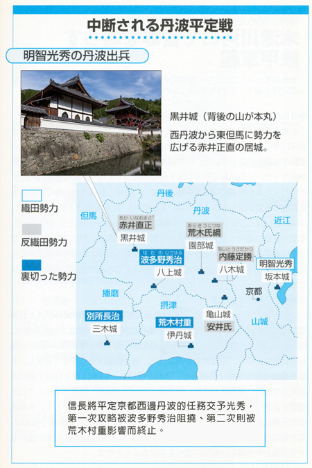 天正3年(1575)5月,在長篠合戰中大勝武田勝頼 後,東邊的威脅及對峙告一段落。為了鞏固京都的防禦,信 長將目標指向京都背面的丹波、丹後,以明智光秀為總大將 大規模出兵。京都西面的丹波國,最有實力的是在八木城的 守護代・内藤氏,但是黑井城的赤井直正擊敗内藤氏的後見 ・松永長頼(久秀之弟),欺壓幼少的守護代・内藤定勝, 統轄丹波西部,侵擾但馬方面。直正支持被逐的將軍・義昭 ,反信長旗幟鮮明,與毛利氏親近。天正3年11月,光秀 領兵入丹波包圍黑井城,高356米的黑井城防禦堅固,加 上在翌年正月,包圍軍中的波多野秀治叛變,光秀急忙撒兵 ,在1月21日返回坂本城。