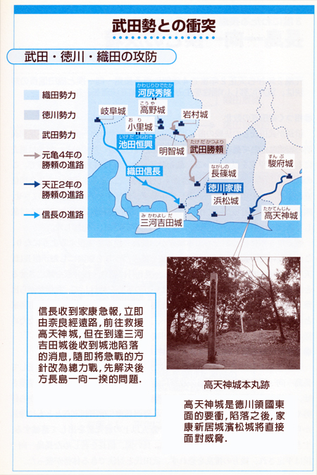 繼承武田信玄的勝賴,在元亀4年(1573)4月信玄 死後以來,一直與家康發生衝突。信玄病逝於信濃伊那後, 家康認為機會來臨,積極進侵東遠江。另一方面,勝賴攻下 家康盟友信長的領國・東美濃的明智城。信長為應付武田軍 對岐阜的威脅,在明智城之西建築小里城及高野城,以池田 恆興及河尻秀隆駐守。為奪回長篠城及阻止家康東進,勝賴 轉而走南路向家康進攻。當知道三河有危機,家康立刻撤兵 回西三河。之後勝賴又再調整軍勢,轉而向遠江進兵,包圍 高天神城。遠江東面要衝高天神城一旦失去,家康居城・浜 松城將會非常危險。