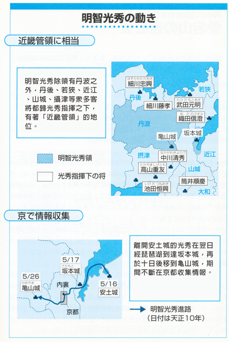 光秀在5月17日進入近江坂本城,之後在5月26日進 入前線丹波亀山城。換言之光秀在坂本城逗留了10天,這 10日裡光秀在做什麼?可能是與公家會面,接收到從朝廷 一方對信長、信忠威壓天皇的看法,知道信長對三職推住的 做法,加上光秀之前擔任馬揃奉行時對信長累積的不信任感 ,開始確信信長有打算成為天上人的野心,於是在心中開始 薀釀襲擊本能寺的想法。