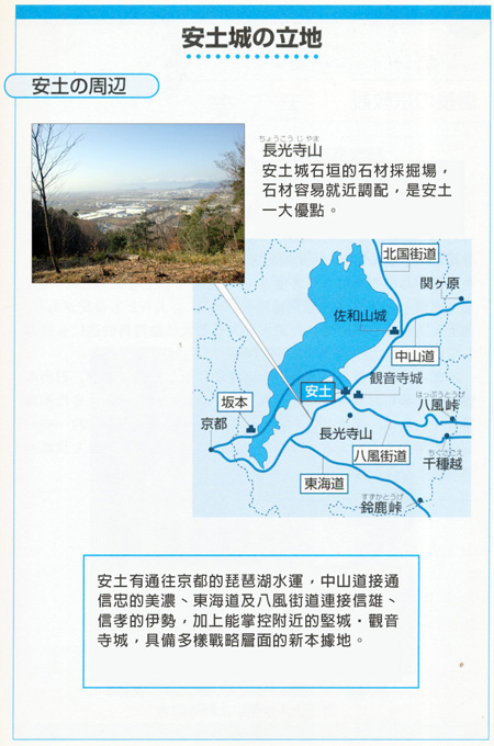 信長以安土為天下之府,此地鄰近織田家源起之地・津田 ,地理上利用千種越丶八風峠丶鈴鹿峠丶關原等通道就能方 便召集到尾張丶伊勢丶美濃的織田一族。將*超大型船解体 後,改建成十艘駿速軍艦,來往安土與京都只需半天時間, 如此便捷的交通方便信長迅速上洛處理政務,又能退回安土 遠離朝廷煩厭的公卿。此外安土周邊又有許多能用於修建石 垣的石材,不似岐阜城般建築在險峻山上,安土鄰近三方湖 水及堅固的河道,背後又能監視觀音寺城,是個兼顧到交通 便捷及戰略層面的天下之府,信長在安土創立了嶄新武家社 會府都的基礎。