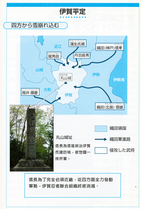 天正6年(1578)3月,信長藉著將繼承傳統忍者領 主的柘植三郎左衛門收為旗下之機,將信雄送到伊賀繼承伊 賀名族北畠家,進駐在上野盆地新建的丸山城。不過信雄在 未經信長的許可下,擅自攻打一揆的本據地天童山,令到一 直向一揆採取懷柔政策的柘植三郎左衛門戰死,好不容易建 成的丸山城亦被佔領。